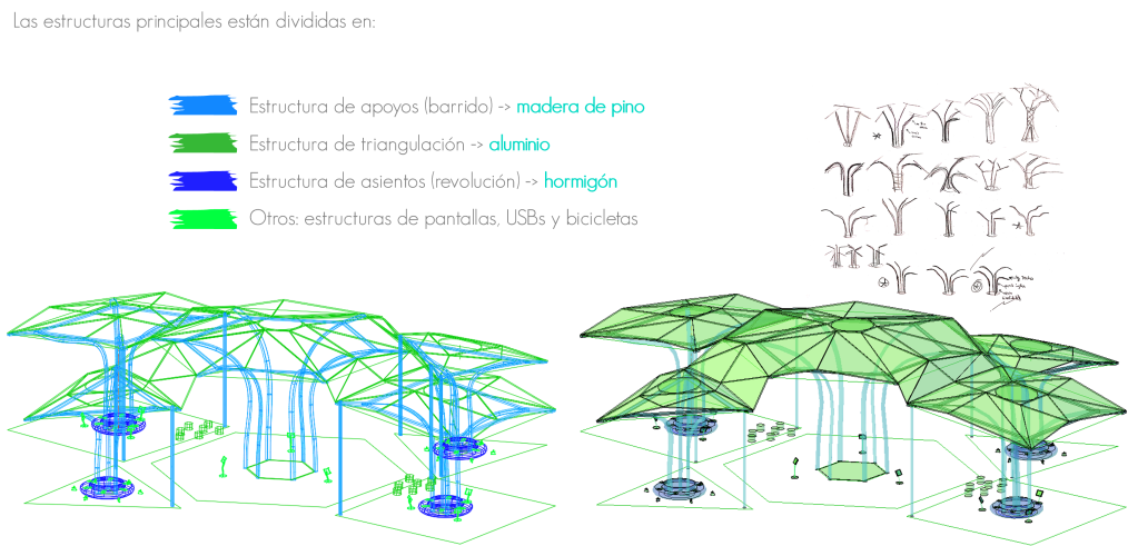 La fabricación de la estructura se llevaría a cabo mediante de doblado de un tipo de madera resistente al clima como puede ser el pino, y una estructura de aluminio fina para fijar los diversos paneles solares.