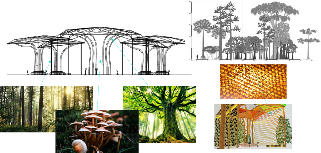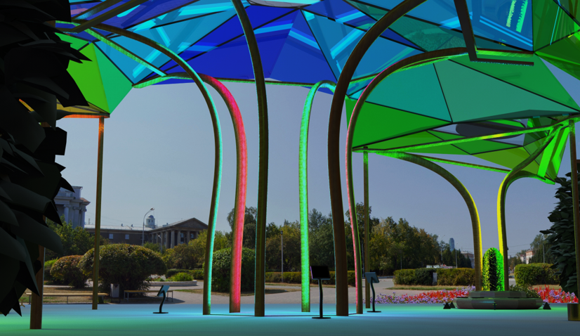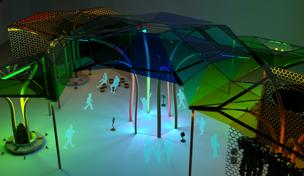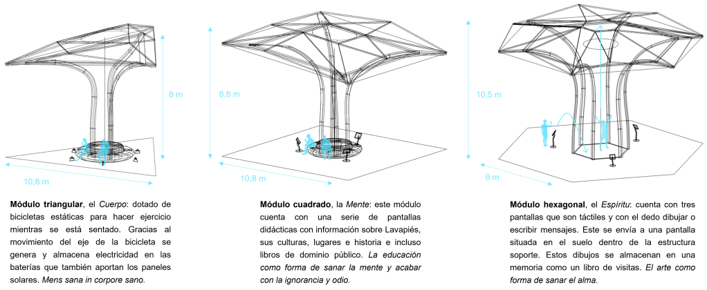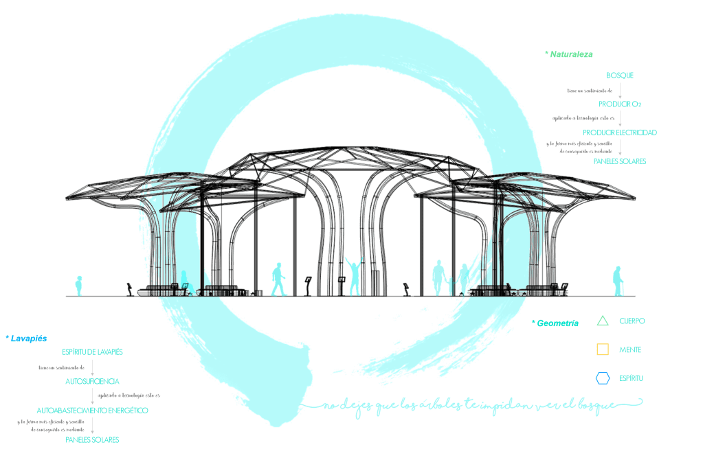 El proyecto es un pabellón abierto basado en un bosque y pensado para la plaza Agustín Lara. Está constituido por tres módulos que cada uno simboliza una parte del ser humano: cuerpo, mente y espíritu. Cuenta con un techo de paneles solares mediante triangulación de múltiples colores en forma de vitral.