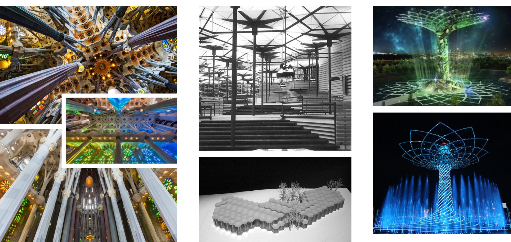 Se cogió inspiración por una parte de la naturaleza (bosques, panales, estructura de la materia en la nanoescala…), arquitectura (orgánica, Gaudí, Corrales y Molezún, Marco Balich…) y arte vanguardista (Kandinsky, Dali, psicodelia…)