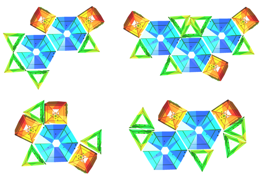 - Entre los módulos para hacer encajar la ascensión de las piezas a la hexagonal o entre ellas al estar en distinta altura y crear mayor aspecto de aleatoriedad en la triangulación, se han elaborado unas uniones trianguladas. Gama cromática de estas actúan como uniones de color.