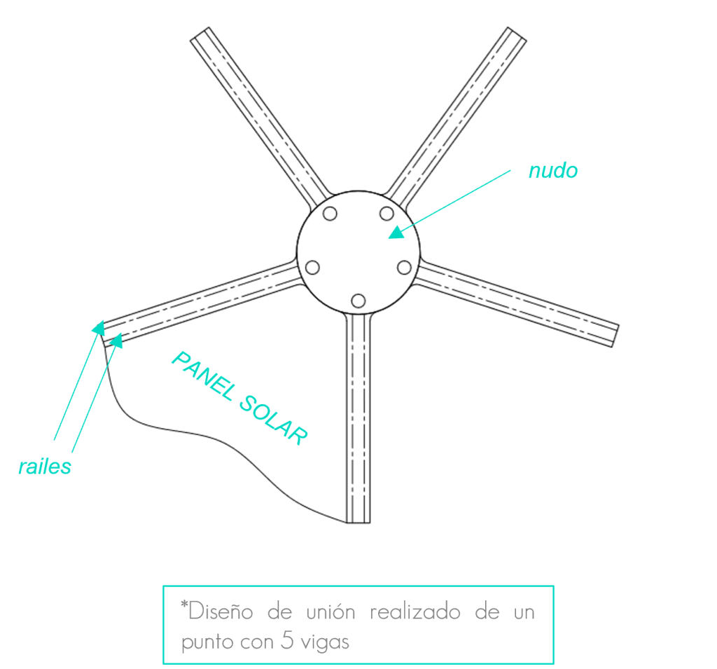 Esta cuenta con un nudo donde se atornillan las distintas vigas que tienen sección transversal en forma de I, para poder apoyar en forma de railes cada lado de los paneles solares. Esto permite ser flexible en el número de vigas que confluyen en el nudo.