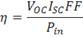 La eficiencia, η, permite comparar rendimientos entre paneles solares y se define como la relación entre la producción de energía de la célula solar y la energía entrante del sol.