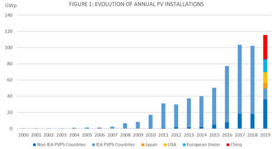 El mercado fotovoltaico mundial superó la marca de los 100 GW por tercer año consecutivo. En 2019, nueve países tienen más de 10 GW de capacidad acumulada, cinco tienen más de 40 GW y solo China representó 204,7 GW. La Unión Europea (EU28), que solía liderar el ranking durante años, perdió su posición de liderazgo en 2015 y ahora ocupa el segundo lugar (131 GW), con EE. UU. tercero (75,9 GW) y Japón cuarto (63 GW)