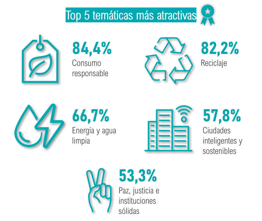 ¿Qué temáticas tratar? Respecto a las temáticas más importantes relacionadas con la sostenibilidad, en la encuesta se enumeraron temas que además relacionados con algunos de los ODS principales, que englobasen no solo al pilar ambiental, sino también a otros más centrados en el económico y social, y la más valorada fue consumo responsable con un 84,4% de los votos (multirespuesta, 45 encuestados), seguido de reciclaje con el 82,2%, energía y agua limpia (66,7%), ciudades inteligentes y sostenibles (57,8%), paz, justicia e instituciones sólidas (53,3%), flora y fauna (51,1%) al igual que agricultura ecológica (51,1%) y acción para el desarrollo (42,2%).