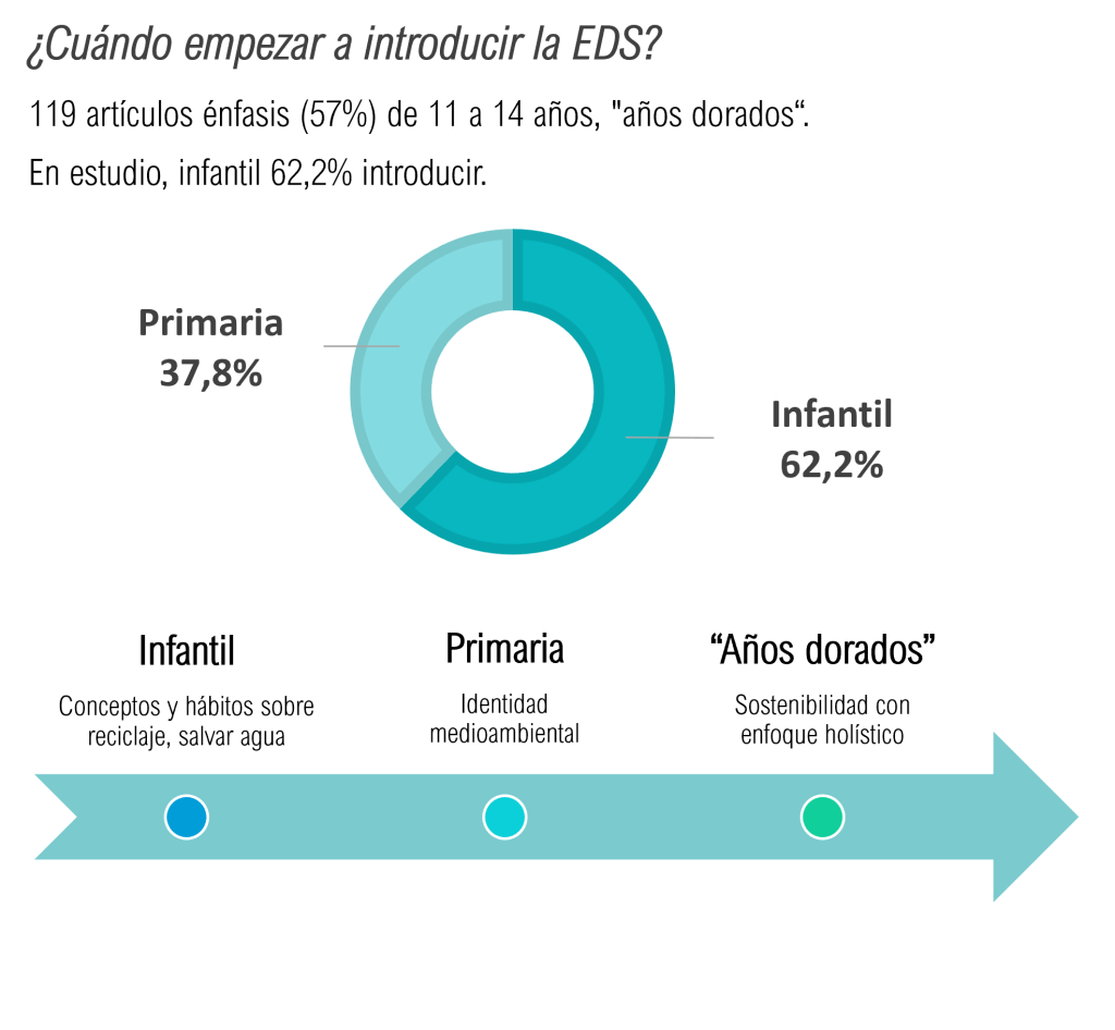 ¿Cuándo empezar a introducir la EDS? Una muestra de 119 artículos incluye un énfasis (57%) en los grados intermedios (de 11 a 14 años), conocidos como los «años dorados» de la educación ambiental en términos de desarrollo moral de los estudiantes. (Ardoin, W. Bowers, Wyman Roth, & Holthuis, 2017) En la encuesta del trabajo, cuando se preguntó el momento en que se debería introducir la educación en sostenibilidad e impacto social y medioambiental por primera vez todas las respuestas figuran en infantil (62,2%) y primaria (37,8) reafirmando que debería de ser ya en edades tempranas, pudiéndose introducir conceptos y hábitos como el reciclaje en educación infantil y en los conocidos “años dorados” una explicación profunda de la sostenibilidad desde un enfoque holístico. En esa edad además ya se puede desarrollar de forma madura lo que se conoce como identidad medioambiental: “todas las formas diferentes en que las personas se interpretan a sí mismas en relación con la tierra, tal y como se manifiesta en la personalidad, los valores, las acciones y el sentido del yo”. (Blatt, 2013)
