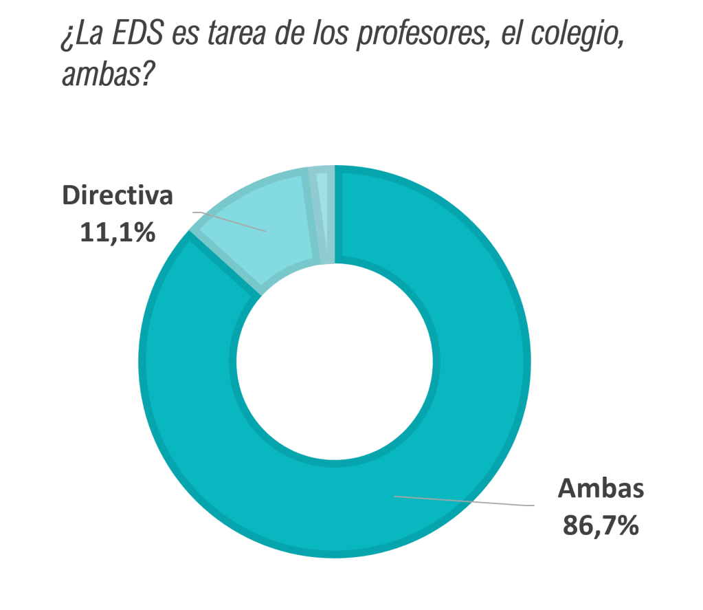 ¿La EDS es tarea de los profesores, el colegio, ambas? En la pregunta: “¿Crees que es un tema de elección para cada profesor en su asignatura o debería estar presente en los valores del colegio?”, 39 profesores (86,7%) de los 45 indicaron que en ambas, seguido de 5 que votaron desde la directiva. Se preguntó a continuación si desde la organización del colegio se planteaban actividades, seminarios, talleres, charlas, días benéficos… relacionados con la sostenibilidad social o medioambiental, y las respuestas fueron en orden: ligeramente (44,4%), sí (42,2%) y no (13,3%).