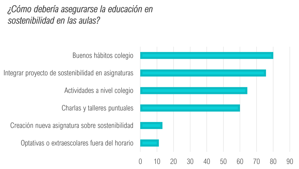 En caso afirmativo voluntariamente podían mencionar alguna y hubo respuestas como: huerto; charlas y proyecciones y un concurso de murales relacionado con los ODS, celebraciones como el día del árbol, charlas, excursiones; recogida de residuos; reciclaje; semana de la cultura; proyectos musicales; día del reciclaje y semana del agua… Se preguntó si los Objetivos de Desarrollo Sostenible (ODS) están presentes de alguna forma en el colegio y asignaturas, y el 55, 6% votó si, 37,8% ligeramente y solo 3 casos afirman que no están presentes. Finalmente se preguntaba cómo debería asegurarse la educación en sostenibilidad en las aulas con una votación multirespuesta, en la que el 80% destacaron la importancia de realizarlo a través de los buenos hábitos del colegio, seguido de un 75,6% que indicaba integrar proyecto y contenido sobre sostenibilidad en las asignaturas actuales, un 64,4% actividades a nivel de colegio, 60% charlas y talleres puntuales, y finalmente creación de una nueva asignatura sobre sostenibilidad (13,3%) y en optativas o extraescolares fuera del horario de curso (11,1%).