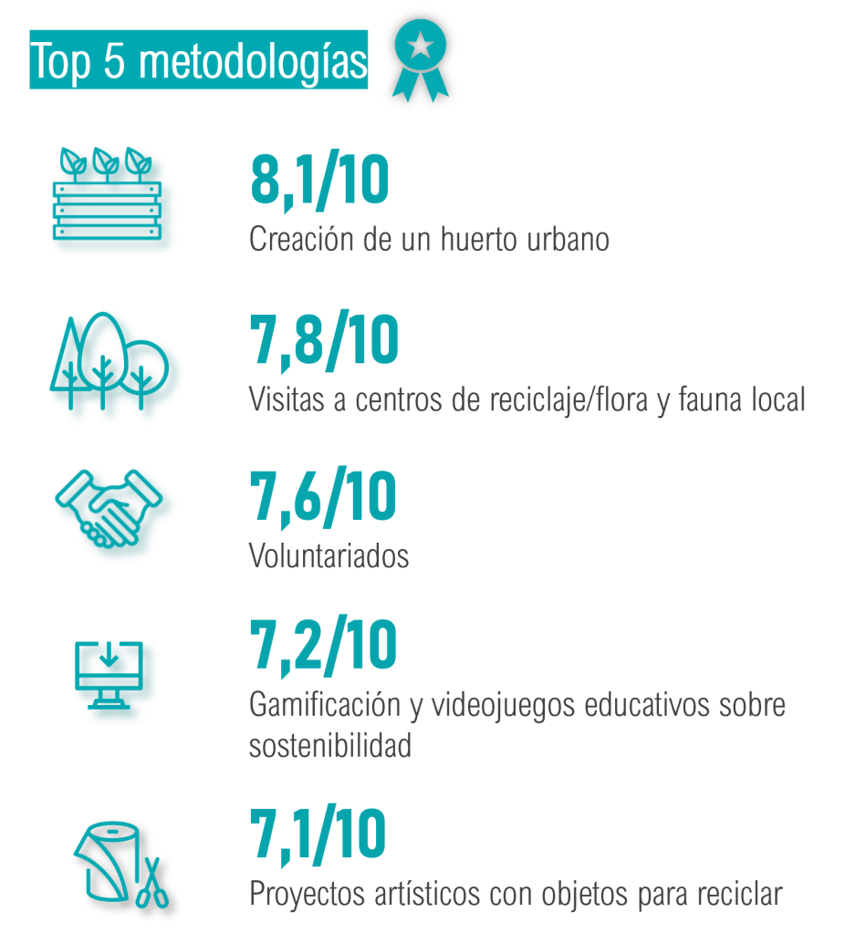 ¿Cuál es la mejor metodología para la EDS? Se pidió a los 45 profesores que puntuasen de 1 a 5 entre una serie de metodologías y estrategias para educar en sostenibilidad en base a cómo de atractivas y útiles las veían para el alumnado. Se obtuvieron los siguientes resultados: