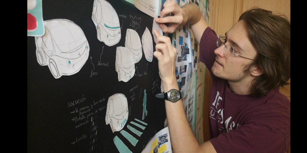 ¿Qué hice entonces? Dedicar semanas hasta que pude viajar de nuevo a leer papers sobre el estado del arte de los vehículos eléctricos y aútonomos, ver miles de videos y conceptos de nuevos coches, formarme sobre EVs, energía solar con organizaciones como IEEE o en UX y Human-Machine interaction con organizaciones como International Design Foundation… y una vez terminada la exploración, hacer mil (y me quedo corto) bocetos de coches existentes para practicar y otros mil para el diseño general del nuevo. No podía empezar a modelar pronto, ¿qué iba a hacer? ¡Pues darle mucha más importancia a la exploración y a la metodología! De esta forma pude crear Birdy Mobility, un vehículo biplaza, autónomo, compartido, adaptado, medidor de constantes vitales, eléctrico y con generador fotovoltaico integrado para producir electricidad mientras se desplaza, que además puede entregar electricidad que genera a la red. Ganando el premio a Mejor TFG de la Comunidad de Madrid por el Cogitim, del grado por la UPM Etsidi y otros reconocimientos.