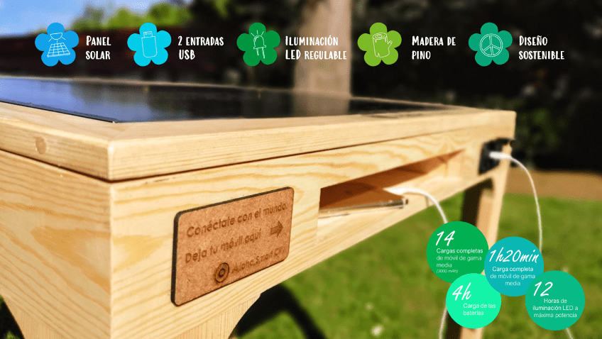 Siguió con un prototipo funcional, el primer producto de Aloha: una #mesa inteligente de madera capaz de generar electricidad con el #sol para cargar dispositivos USB e iluminar de forma regulable en color e intensidad, top 10 ideas de actúaupm Programa de Emprendimiento UPM de entre más de 450, diploma a mejor startup y otros premios como GRECO – Putting Open Science into Action.