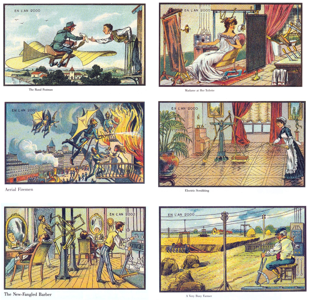En estas preciosas y originales ilustraciones podemos atisbar inventos parecidos a actuales… pero no del todo. Vemos los gérmenes de los robots de limpieza, drones para incendios y reparto o agricultura automatizada, pero basados en los medios y tecnologías de la época. Y es que nuestro cerebro está programado para pensar de forma lineal.