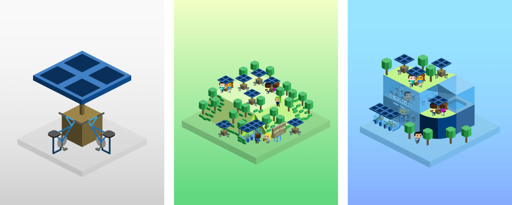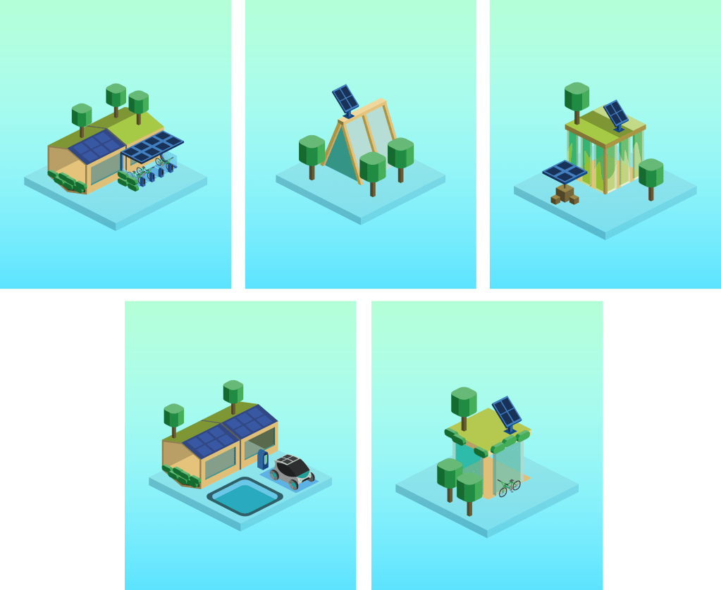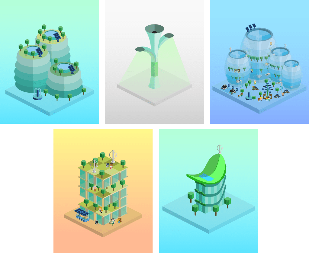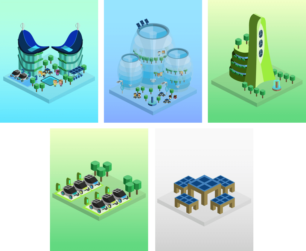 Ahora bien, ¿qué tendencias en diseño y arquitectura sostenible se están empleando para idear las ciudades del futuro? He identificado 12 acompañadas por diseños propios e ilustraciones que diseñé para NFT Ecocity.