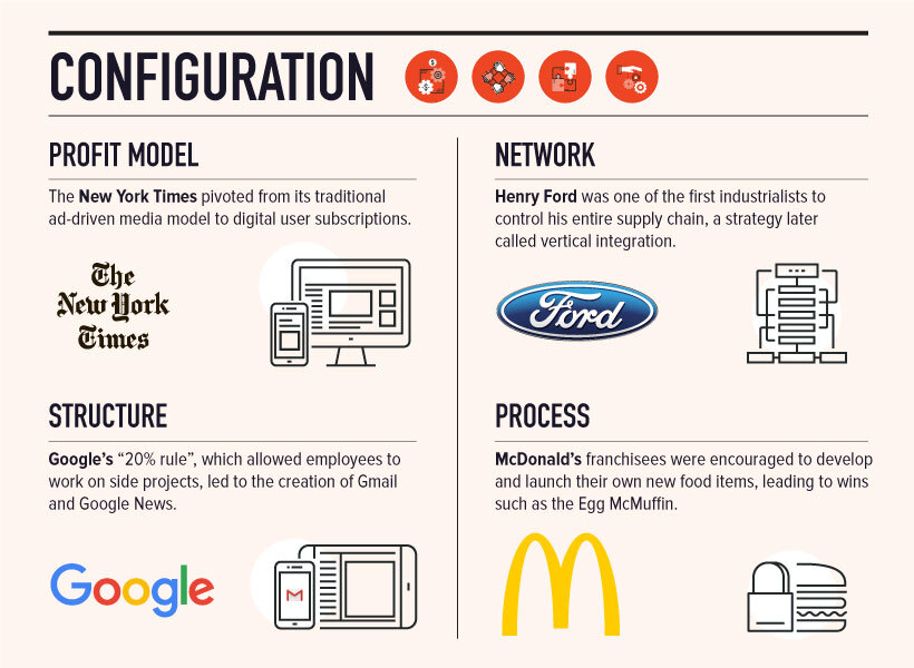 Estos tipos se dividen en «Configuración», centrados en la estructura interna de la empresa, «Oferta», que se enfoca en mejorar el rendimiento del producto, y «Experiencia», los más orientados al cliente.