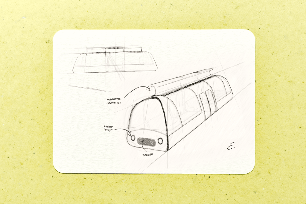 🌌 With its sleek and futuristic design, this train glides effortlessly through the sky, supported by structures with solar panels that harness the sun’s energy. Illuminated poles and headlights inspired by eyes give it a mesmerizing presence, while a dynamic screen displays messages like stops and greetings, adding a touch of personality to the journey.